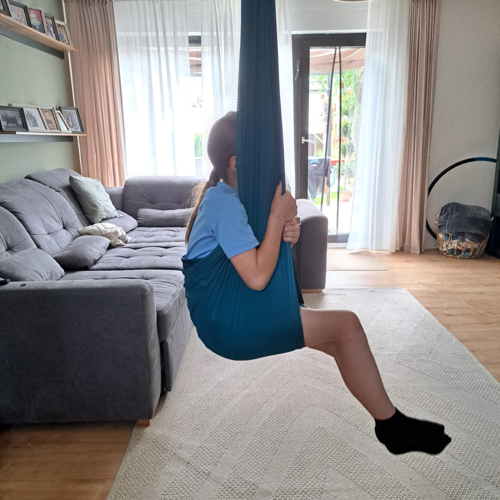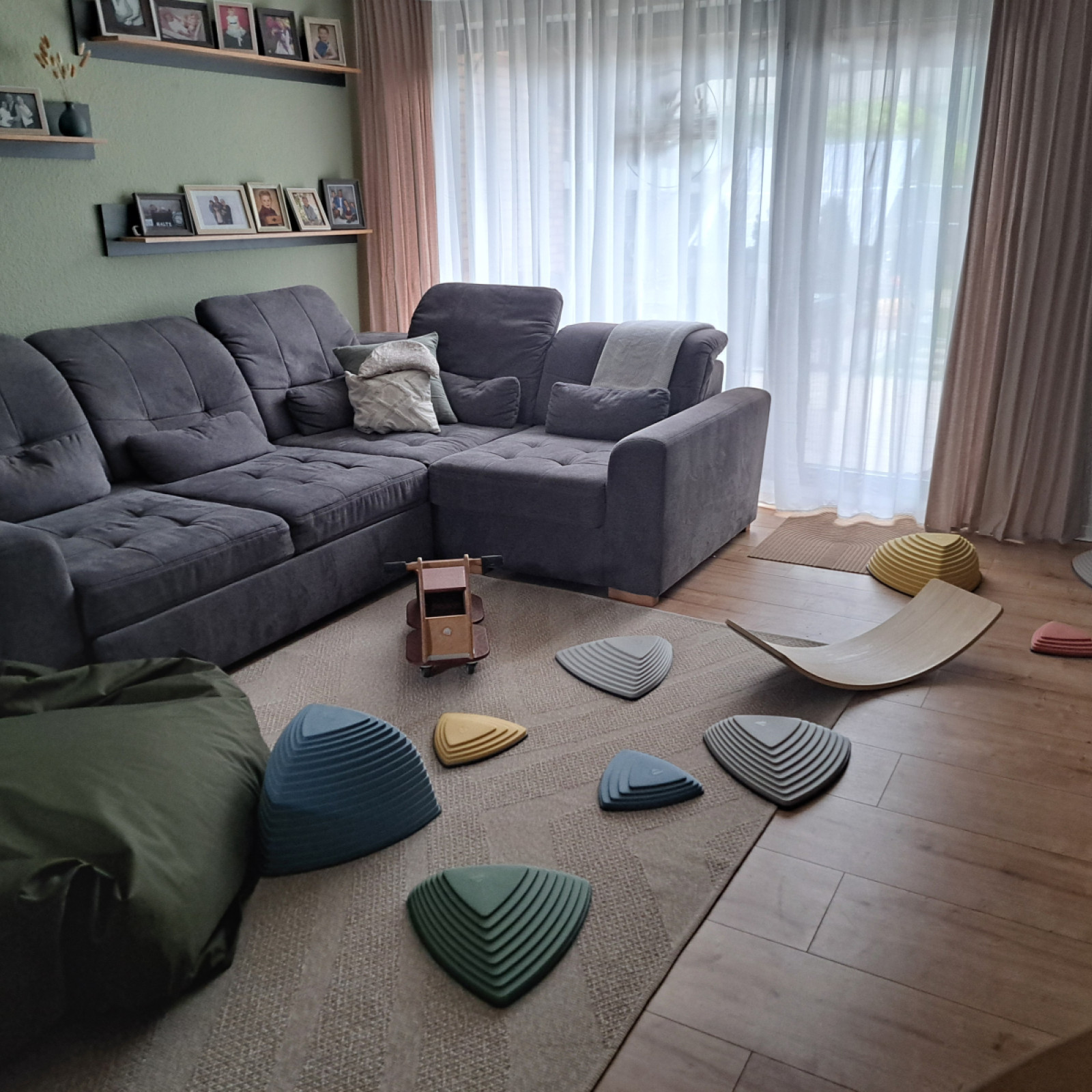 In unseren großen Wohnbereich werde ich mit den Kindern hauptsächlich Bewegungsangebote praktizieren. Wir haben an der Decke z.B. eine Tuchschaukel, ein großes Sitzkissen, ein Balanceboard und verschieden große Flusssteine. Auch Yoga mache ich immer gerne hier, da wir hier am meisten Platz zur Verfügung haben.