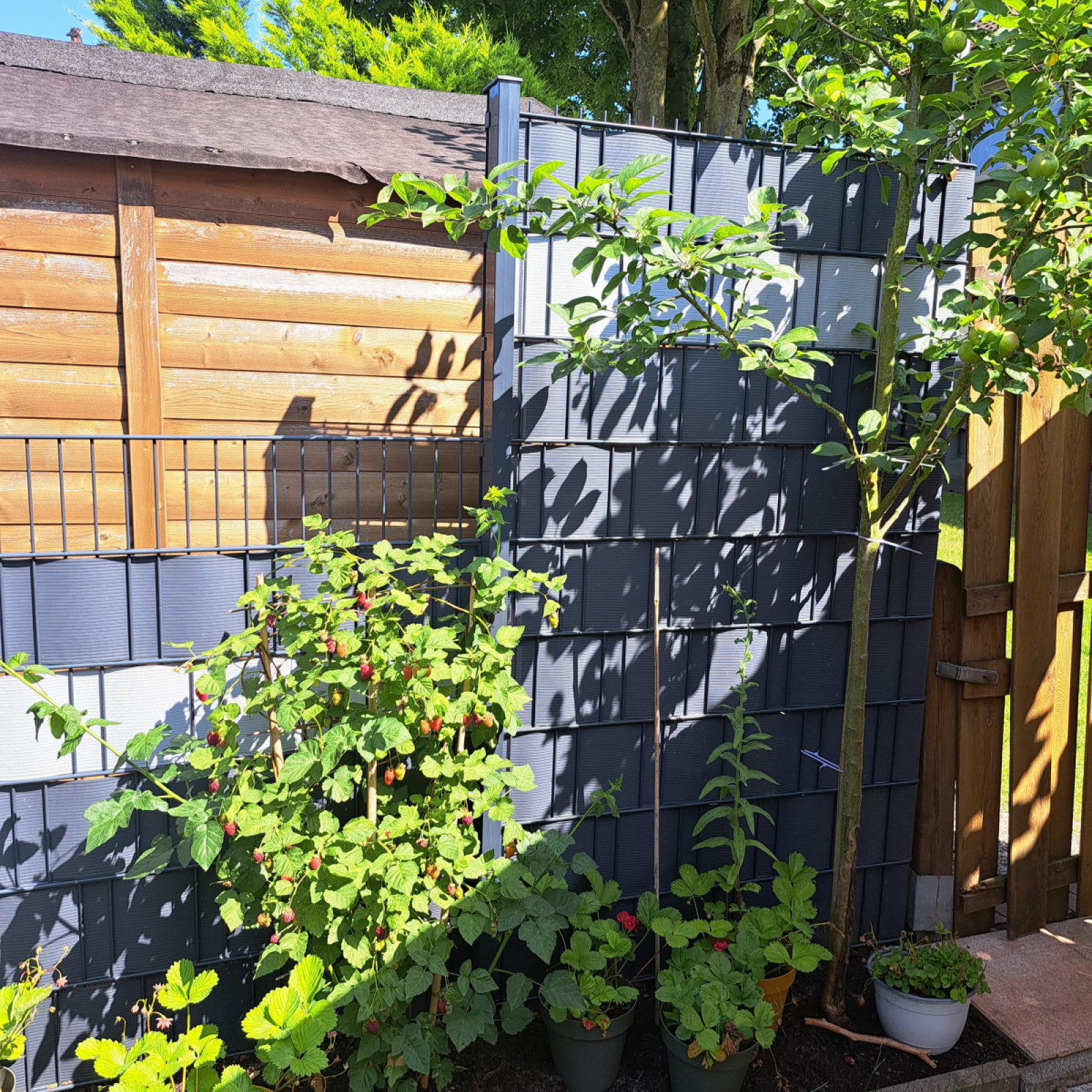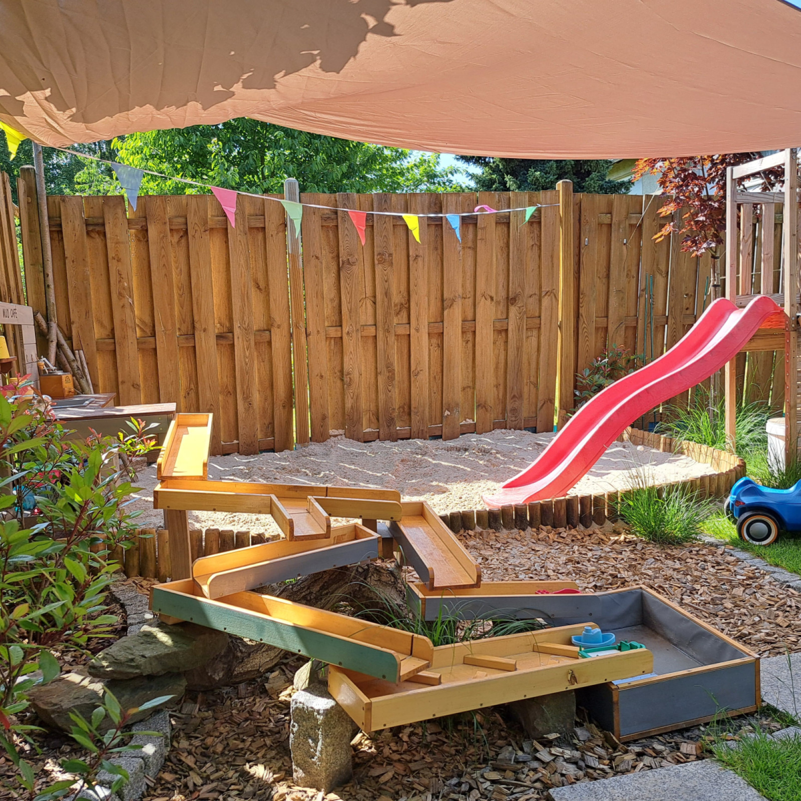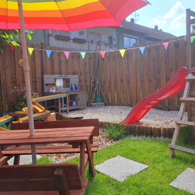 Von unserem Wohnraum aus gelangt man auch in den Garten, der viele Spielmöglichkeiten für Kinder bietet. An unserem Baum hängt eine Schaukel, zwischendurch wird diese mit Turnringen getauscht. Im hinteren Bereich des Gartens, befindet sich ein Stelzenhaus mit Kletterwand, Rutsche und darunter ein Sandkasten mit Matschküche und Wasserbahn.